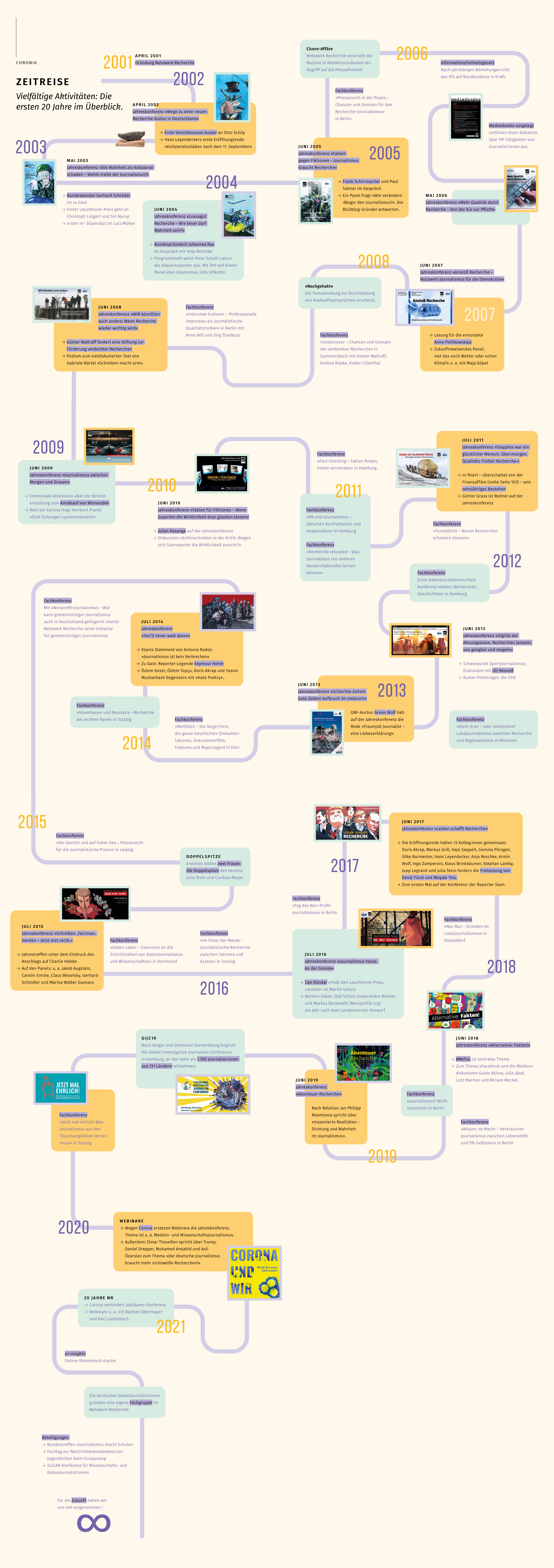 Seit einem Vierteljahrhundert setzt sich Netzwerk Recherche für investigative Recherchen und journalistische Qualität ein. Am bekanntesten ist sicher unsere Jahreskonferenz, die von einigen sogar nur „Die Netzwerk Recherche“ genannt wird. Sie findet seit 2002 beim NDR in Hamburg statt und im Rückblick schmunzeln wir über so manchen Konferenztitel („Sisyphos war ein glücklicher Mensch. Über:morgen. Qualitäts-Treiber Recherche“ oder „DigiTal der Ahnungslosen. Recherchen jenseits von googlen und mogeln.“) Beliebt ist das „Klassentreffen der investigativen Journalist:innen“ wie eh und je: In diesem Jahr verkauften sich die Tickets für die NR26 in weniger als einem Monat (noch bevor das Programm veröffentlicht ist)!