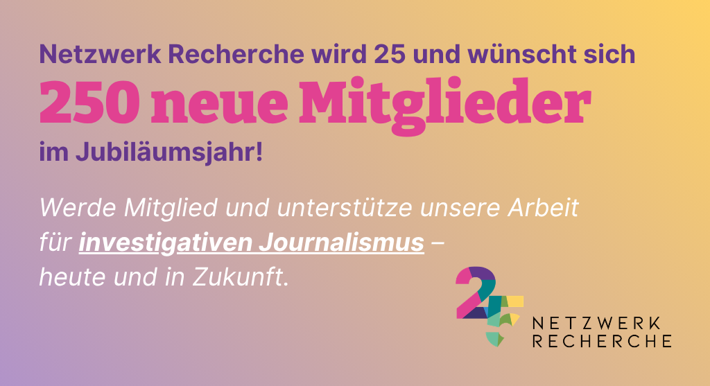 25 Jahre Netzwerk Recherche – das sind 25 Jahre unermüdliche Arbeit für starke Recherchen und journalistische Qualität. Damit wir diese Arbeit auch in Zukunft leisten können, brauchen wir vor allem eines: Menschen wie dich, die unseren Verein mit ihrer Mitgliedschaft tragen. Zu unserem Geburtstag wollen wir deshalb nicht nur feiern, sondern die Gelegenheit nutzen, um auf einen Wunsch aufmerksam zu machen: 250 neue Mitglieder in unserem Jubiläumsjahr.