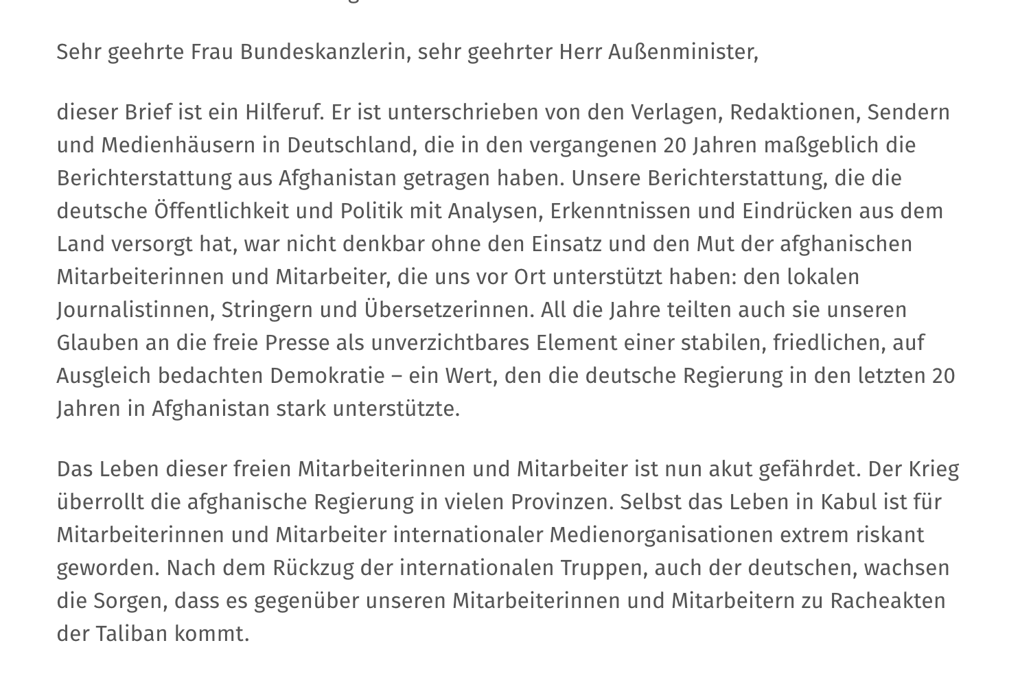 Internationalen Menschenrechtsorganisationen zufolge gibt es weltweit kaum ein Land, in dem Journalistinnen und Journalisten mittlerweile so gefährdet sind wie in Afghanistan. Wir rufen Sie hiermit auf, ein Visa-Notprogramm für afghanische Mitarbeiterinnen und Mitarbeiter deutscher Medienhäuser einzurichten. Wir schließen uns damit Appellen britischer und US-amerikanischer Medien an ihre jeweiligen Regierungen an.