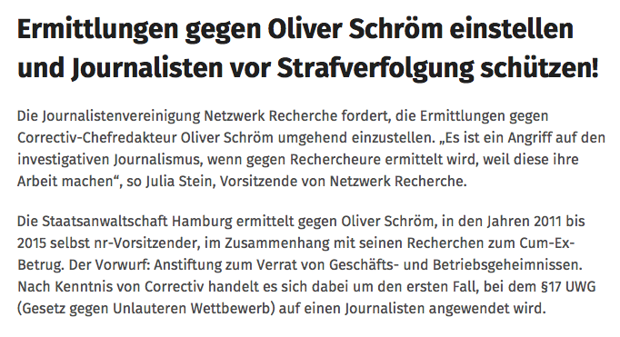 Die Staatsanwaltschaft Hamburg ermittelt gegen Oliver Schröm, in den Jahren 2011 bis 2015 selbst nr-Vorsitzender, im Zusammenhang mit seinen Recherchen zum Cum-Ex-Betrug. Der Vorwurf: Anstiftung zum Verrat von Geschäfts- und Betriebsgeheimnissen. Nach Kenntnis von Correctiv handelt es sich dabei um den ersten Fall, bei dem §17 UWG (Gesetz gegen unlauteren Wettbewerb) auf einen Journalisten angewendet wird.