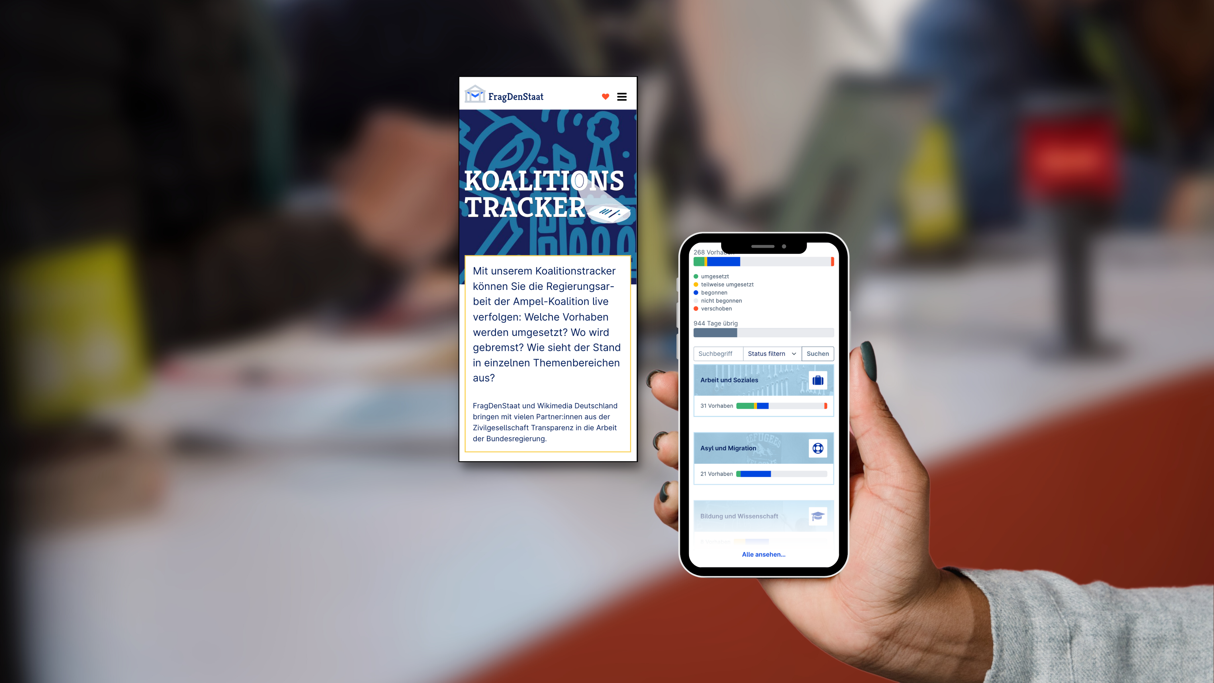 Die Auskunftsrechteplattform FragDenStaat schaut der Regierung mit dem neuen Koalitionstracker auf die Finger – und wir machen mit. Welche Vorhaben setzt die Ampel-Koalition um? Wo wird gebremst? Auf der Plattform lassen sich die Fortschritte in 13 Themenbereichen verfolgen.