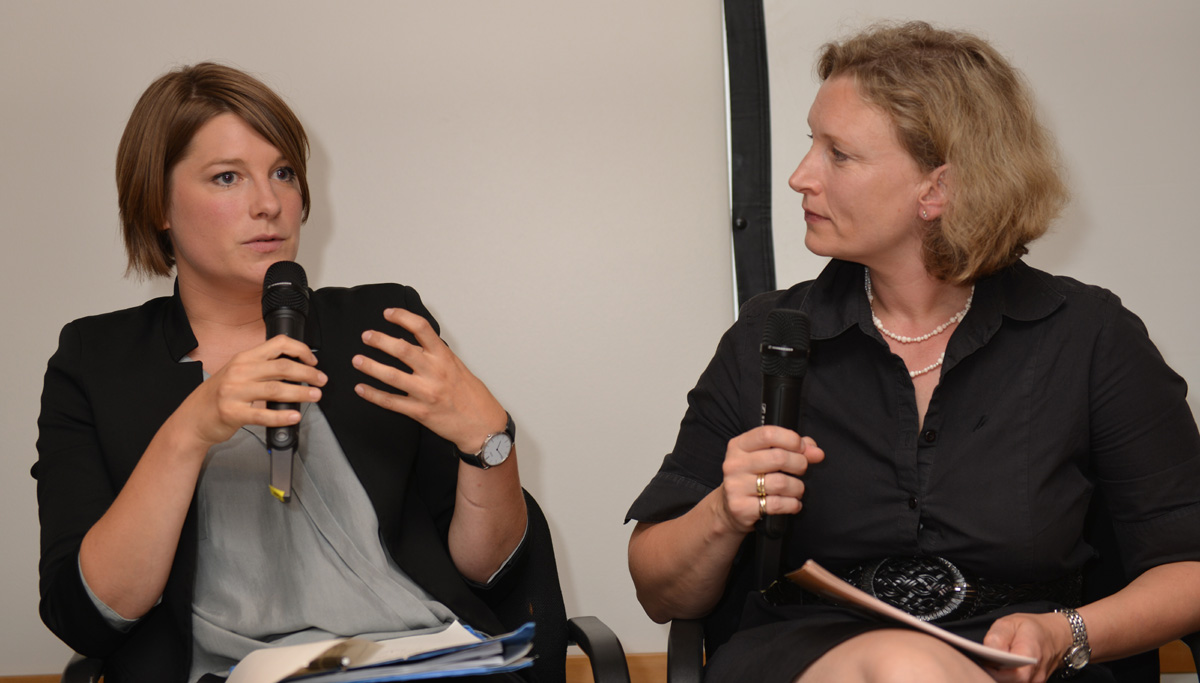 Mentoren können junge Journalistinnen ermuntern, sagt Lena Kampf (links) im Gespräch mit Moderatorin Annette Leiterer. Foto: Wulf Rohwedder