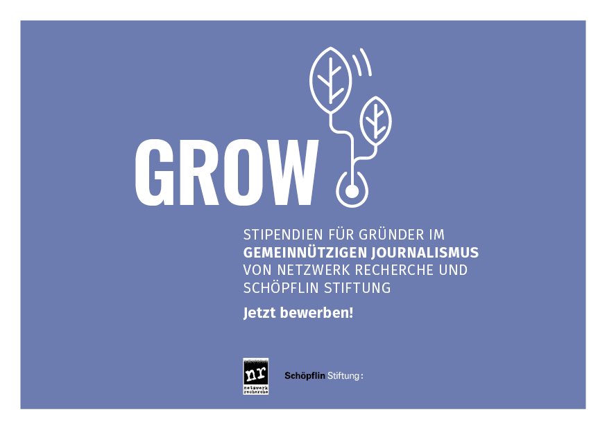 Die in diesem Jahr auf je 3.000 Euro aufgestockten Grow-Stipendien werden vergeben an journalistische Start-ups, die einen klaren Recherche-Schwerpunkt haben und nicht profitorientiert sind. Wir vermitteln den Stipendiatinnen und Stipendiaten Know-how und Kontakte, damit der Start gelingen und das Projekt wachsen kann. Ermöglicht wird das Stipendienprogramm von der Schöpflin Stiftung. Hier gibt es mehr Informationen zu den Bedingungen, zum Ablauf des Bewerbungsverfahrens und zur Jury.