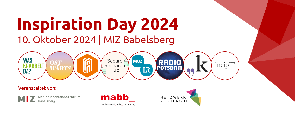 Der diesjährige Inspiration Day bietet Raum für Inspiration und Innovation. Veranstaltet vom Medieninnovationszentrum Babelsberg (MIZ) in Kooperation mit Netzwerk Recherche (NR) und der Medienanstalt Berlin-Brandenburg (mabb) können Medienmacher:innen am 10. Oktober 2024 eine Vielzahl neuer Inhalte, Tools und Teams kennenlernen. Der kostenlose Praxistag richtet sich an alle, die mit der Produktion von medialen Inhalten zu tun haben, und bietet acht Workshops an, in denen innovative Ansätze und Technologien präsentiert und weiterentwickelt werden. Mit dabei sind jeweils drei Förderprojekte vom MIZ und NR und zwei geförderte Projekte der mabb, die allesamt neuartige Ansätze, Inhalte, Methoden und technische Lösungen für den Medienbereich entwickeln.