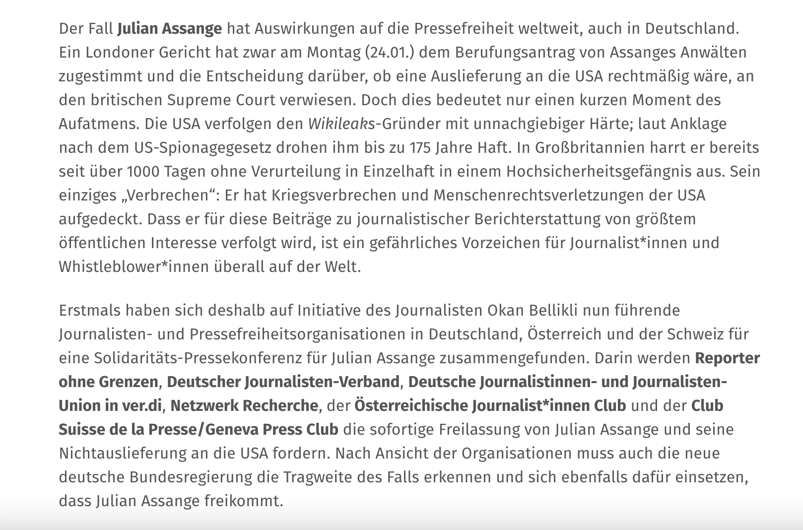 Erstmals haben sich deshalb auf Initiative des Journalisten Okan Bellikli nun führende Journalisten- und Pressefreiheitsorganisationen in Deutschland, Österreich und der Schweiz für eine Solidaritäts-Pressekonferenz für Julian Assange zusammengefunden. Darin werden Reporter ohne Grenzen, Deutscher Journalisten-Verband, Deutsche Journalistinnen- und Journalisten-Union in ver.di, Netzwerk Recherche, der Österreichische Journalist*innen Club und der Club Suisse de la Presse/Geneva Press Club die sofortige Freilassung von Julian Assange und seine Nichtauslieferung an die USA fordern. Nach Ansicht der Organisationen muss auch die neue deutsche Bundesregierung die Tragweite des Falls erkennen und sich ebenfalls dafür einsetzen, dass Julian Assange freikommt.