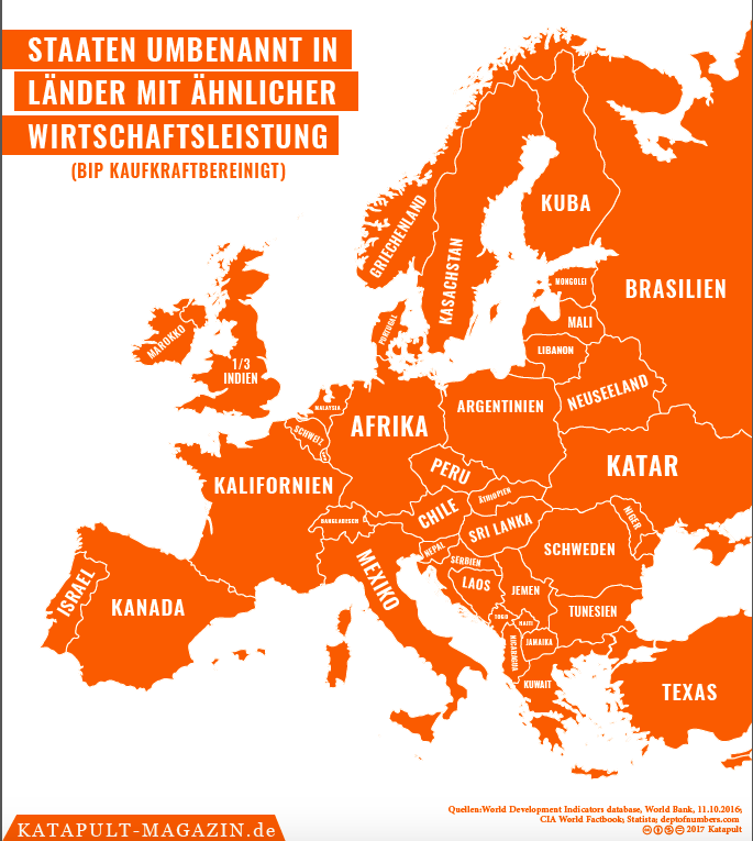 Typisch für Katapult: gewitzte Grafiken wie diese, die europäische Staaten in Länder oder Regionen mit ähnlicher Wirtschaftsleistung umbenennt.