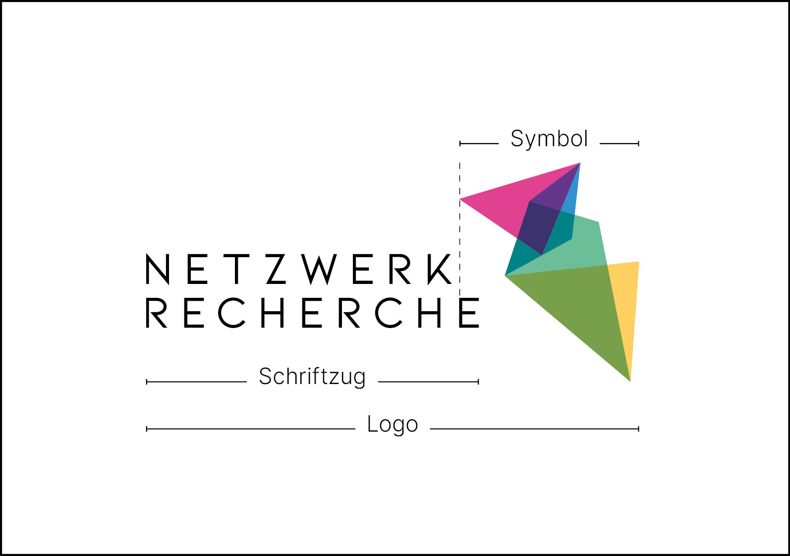 Aus einer ganzen Reihe von Entwürfen wählten Vorstand und Geschäftsstelle schließlich eine Kombination aus Bild- (Netzstruktur) und Wortmarke (Netzwerk Recherche). Die Wortmarke ist in Schwarz, die Bildmarke in acht Corporate Colors gesetzt. Diese sollen künftig einzelnen Arbeitsbereichen und Projekten zugeordnet werden und so zur optischen Strukturierung und Orientierung beitragen.