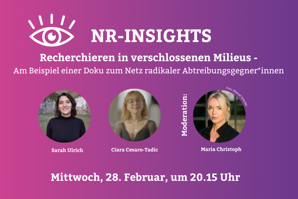 Wie recherchiert man in verschlossenen Milieus? Wie lassen sich komplexe Netzwerke abbilden? Und wie kann man ein umfassendes Thema auf das Wesentliche herunterbrechen, ohne dabei an Spannung zu verlieren? Beim NR-insights am 28. Februar um 20:15 möchten wir euch einen tiefen Einblick in die aktuelle Recherche der Journalistinnen Ciara Cesaro-Tadic und Sarah Ulrich geben, die für das ZDF-Format „Die Spur“ im Netz radikaler Abtreibungsgegner:innen recherchiert haben. Gemeinsam mit Moderatorin Margherita Bettoni diskutieren sie, wie sie bei ihrer Recherche vorgegangen sind. Wir laden alle NR-Mitglieder herzlichst ein und freuen uns auf eine rege Beteiligung am Gespräch. Weitere Infos gibt’s hier.