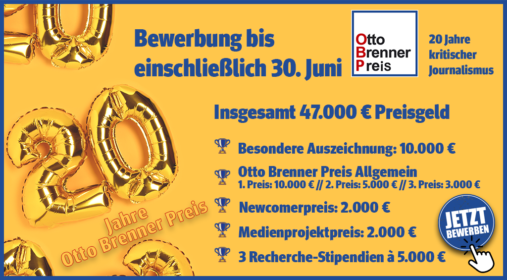 Bis Monatsende können Journalist:innen sich noch für den Deutschen Preis für Klimajournalismus bewerben. Er wird in den Kategorien „Hauptpreis“, „Investigativ“ und „Lokal“ vergeben, die jeweils mit 2.000 Euro dotiert sind. Die Bewerbungsfrist endet am 31. Mai 2024.