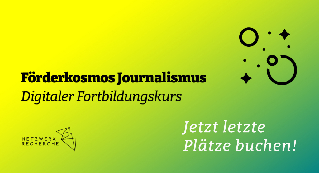 Du hast eine Idee für eine Recherche oder ein Projekt, weißt aber nicht, wie du das finanzieren sollst? Die Fortbildung Förderkosmos Journalismus kann dir helfen, die Förderlandschaft zu überblicken und deine Chancen auf eine Förderung zu erhöhen. Der Kurs startet am 28. Mai und kostet 300 Euro (für NR-Mitglieder nur 200 Euro – werde jetzt noch schnell Mitglied)! Extra-Chance für Nachzügler:innen: Melde dich noch rasch bis Sonntag, 26. Mai, an und sei dabei!