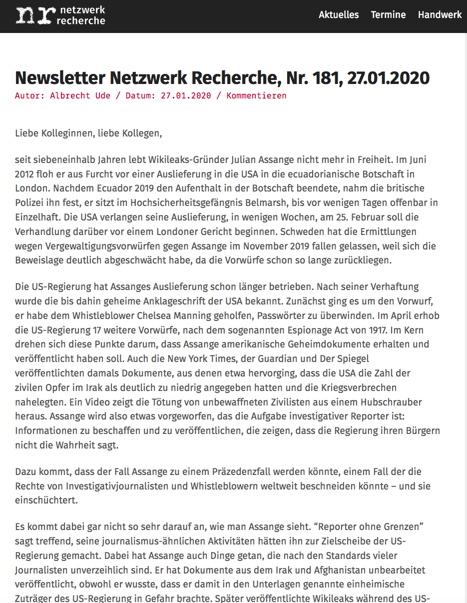 Newsletter Netzwerk Recherche, Nr. 181, 27.01.2020