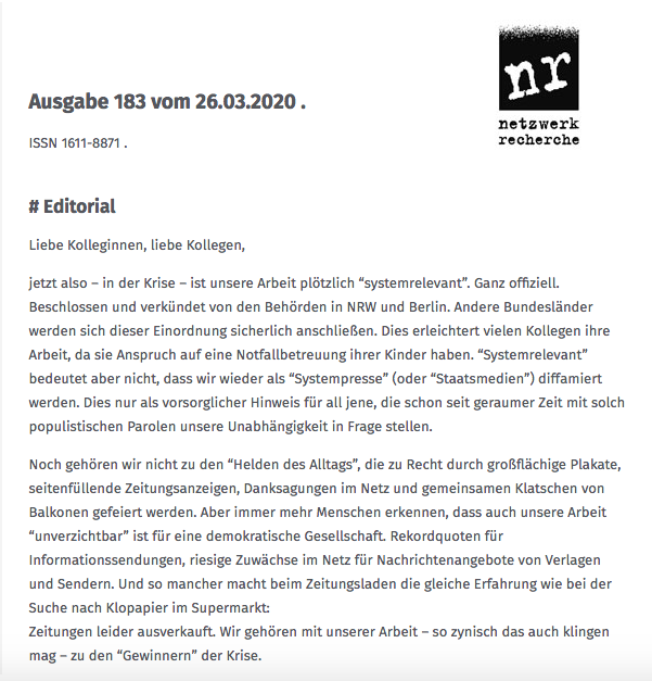 Newsletter Netzwerk Recherche, Nr. 183, 26.03.2020