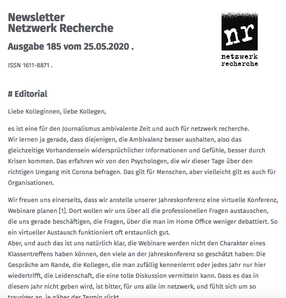 Newsletter Netzwerk Recherche, Nr. 185, 25.05.2020
