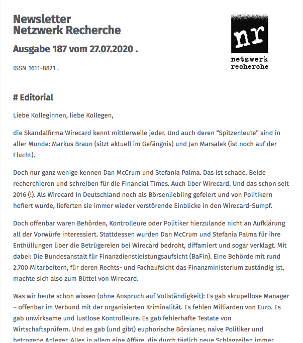 Newsletter Netzwerk Recherche, Nr. 187, 27.07.2020