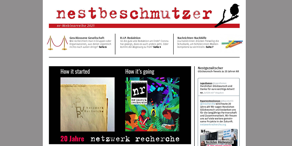 Bereits zum siebten Mal in Folge haben Studierende aus dem Master-Studiengang Journalistik und Kommunikationswissenschaften an der Universität Hamburg zum traditionellen Termin der Jahreskonferenz von Netzwerk Recherche (nr) den nestbeschmutzer produziert. Die Tagungszeitung, die den diesjährigen Webinartag begleitet, war für die meisten Autor:innen der erste Berührungspunkt zum Medienjournalismus.