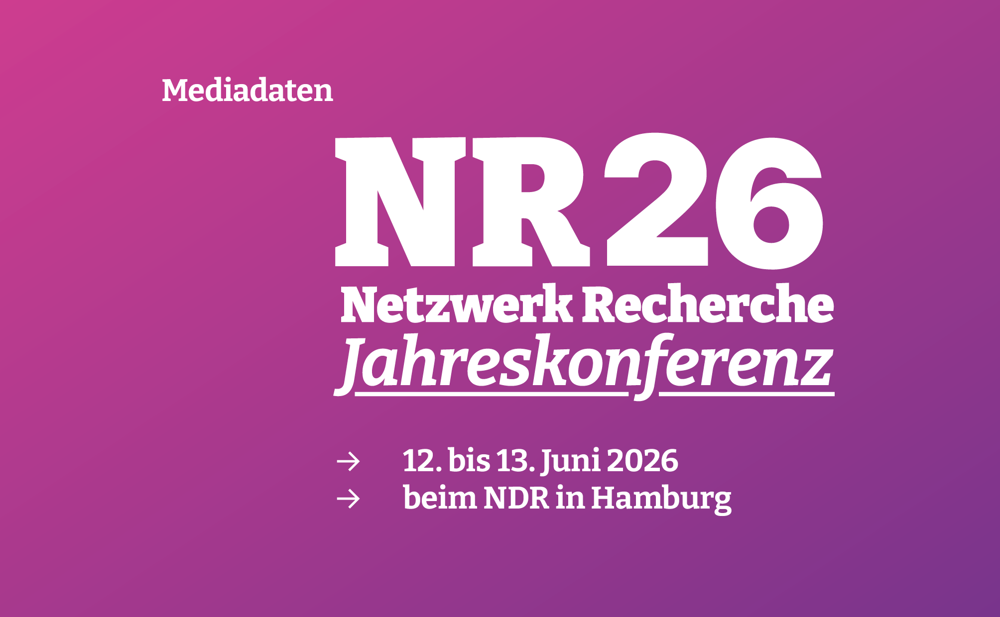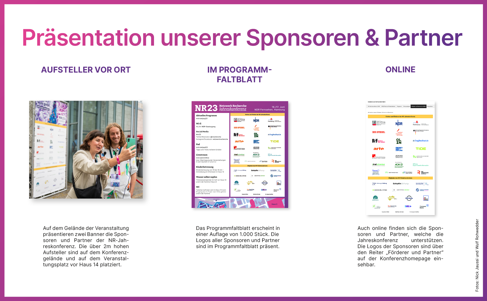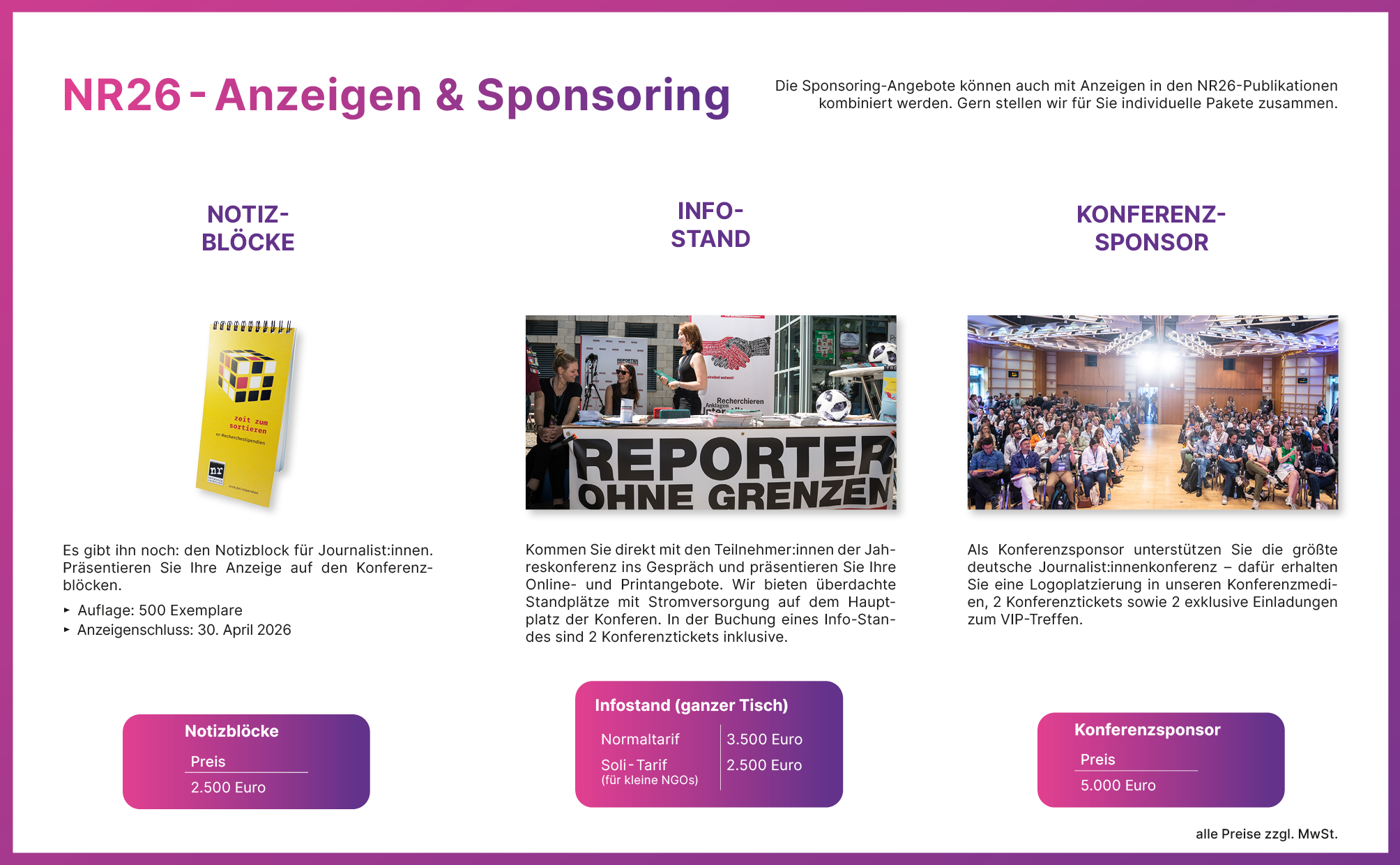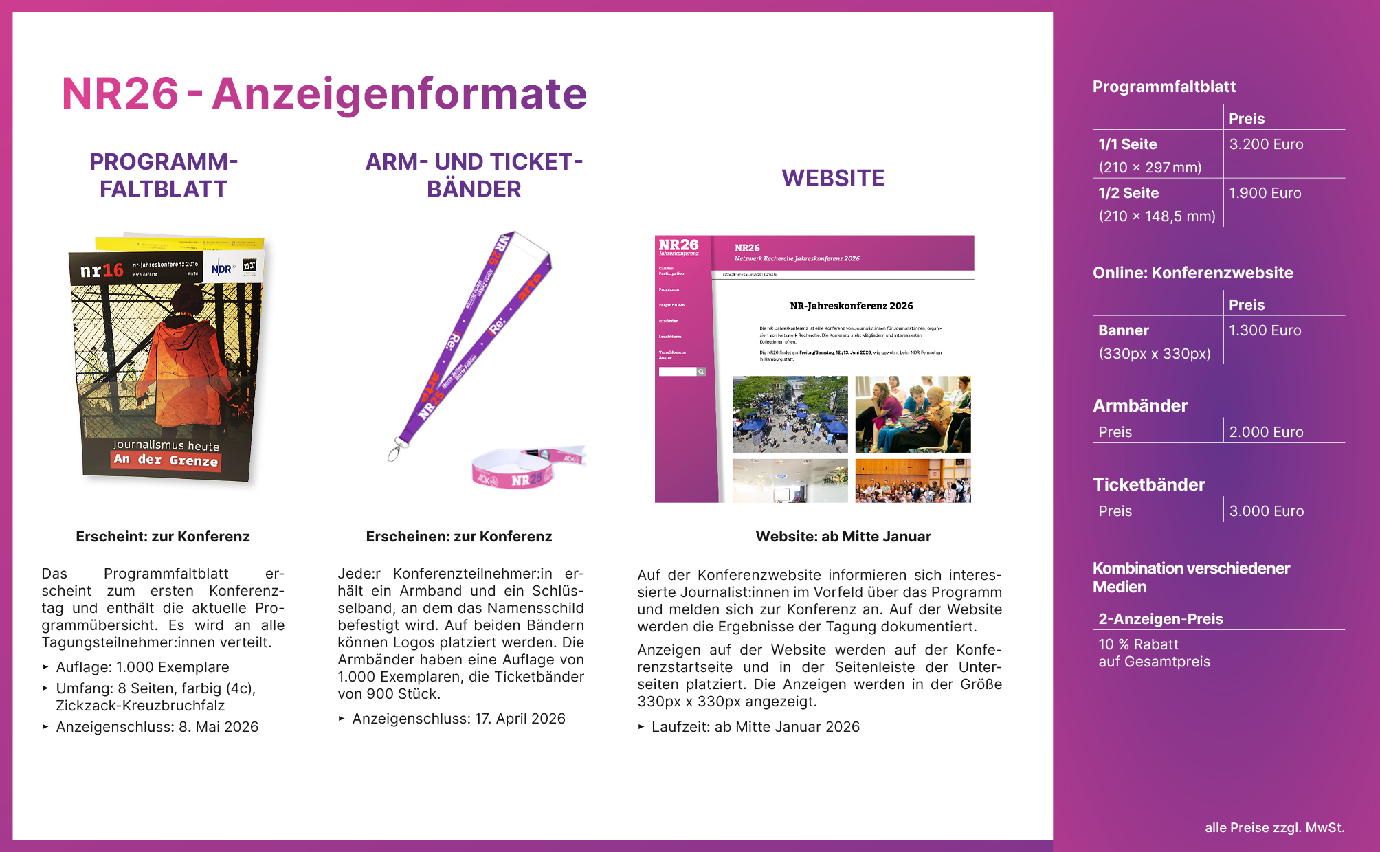 Organisationen, Unternehmen und Initiativen haben bei uns die Möglichkeit, gezielt Sichtbarkeit zu erwerben und ihre Angebote in einem hochwertigen, journalistischen Umfeld zu präsentieren. Macht Eure Organisation auf der Jahreskonferenz sichtbar – ob gedruckt, online oder direkt vor Ort: Auf der NR26 erreicht Ihr ein fachlich kompetentes und interessiertes Publikum und positioniert Euch sichtbar.